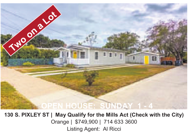 130 S. PIXLEY ST| May Qualify for the Mills Act (Check with the City) Orange | $749,900 | 714 633 3600 Listing Agent: Al Ricci