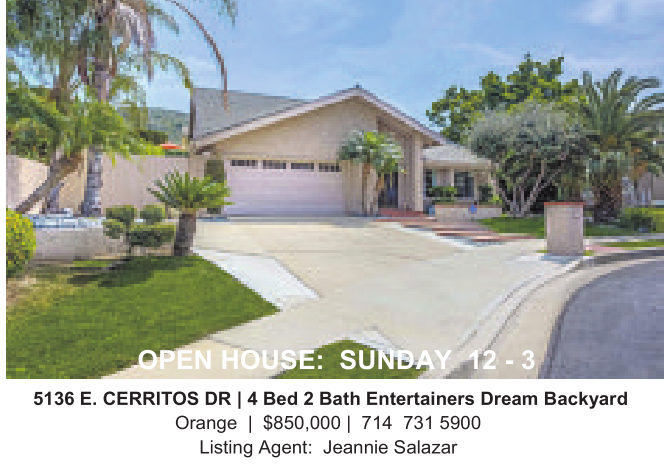 5136 E. CERRITOS DR |4Bed 2Bath Entertainers Dream Backyard Orange | $850,000 | 714 731 5900 Listing Agent: Jeannie Salazar