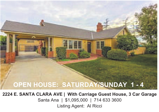2224 E. SANTA CLARA AVE | With Carriage Guest House, 3Car Garage Santa Ana | $1,095,000 | 714 633 3600 Listing Agent: AlRicci