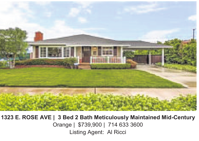 1323 E. ROSE AVE | 3Bed 2Bath Meticulously Maintained Mid-Century Orange | $739,900 | 714 633 3600 Listing Agent: AlRicci