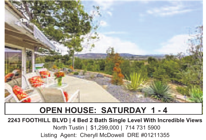 2243 FOOTHILL BLVD |4Bed 2Bath Single Level With Incredible Views North Tustin | $1,299,000 | 714 731 5900 Listing Agent: Cheryll McDowell DRE #01211355