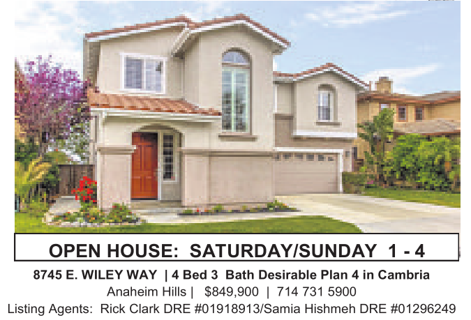 8745 E.WILEY WAY | 4Bed 3 Bath Desirable Plan 4inCambria Anaheim Hills | $849,900 | 714 731 5900 Listing Agents: Rick Clark DRE #01918913/Samia Hishmeh DRE #01296249