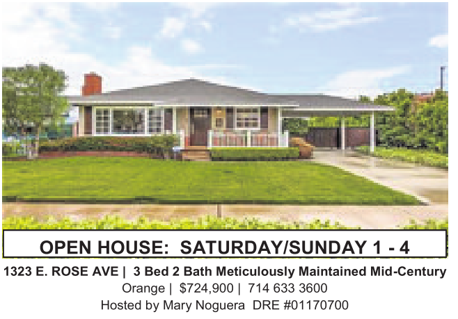1323 E.ROSE AVE | 3Bed 2Bath Meticulously Maintained Mid-Century Orange | $724,900 | 714 633 3600 Hosted by Mary Noguera DRE #01170700