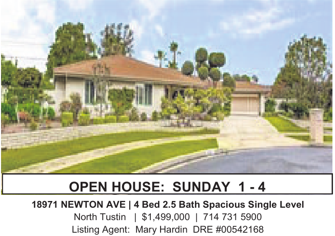 18971 NEWTON AVE |4Bed 2.5 Bath Spacious Single Level North Tustin | $1,499,000 | 714 731 5900 Listing Agent: Mary Hardin DRE #00542168