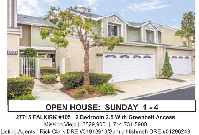 27715 FALKIRK #105 |2Bedroom 2.5 With Greenbelt Access Mission Viejo | $529,900 | 714 731 5900 Listing Agents: Rick Clark DRE #01918913/Samia Hishmeh DRE #01296249