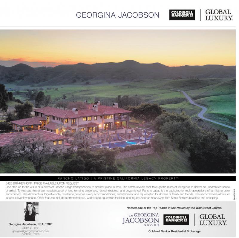 GEORGINA JACOBSON R A N C H O L AT I G O | A P R I S T I N E C A L I F O R N I A L E G A C Y P R O P E R T Y 3420 BRINKERHOFF | PRICE AVAILABLE UPON REQUEST One step on to the 4600-plus acres of Rancho Latigo transports you to another place in time. The estate reveals itself through the miles of rolling hills to deliver an unparalleled sense of arrival. To this day, this single massive parcel of land remains preserved, rested, restored, and unvarnished. Rancho Latigo is the backdrop for multi-generations of families to grow and connect. The Architectural Digest-worthy residence provides luxury accommodations, entertainment and rejuvenation for dozens of family and friends. The second home allows for luxurious overflow space. Other features include a private helipad, world-class equestrian facilities, and is just under an hour away from Santa Barbara beaches and shopping. Named one of the Top Teams in the Nation by the Wall Street Journal Georgina Jacobson, REALTOR ® 949.285.8380 georgina@georginajacobson.com CalBRE#01176109 Coldwell Banker Residential Brokerage