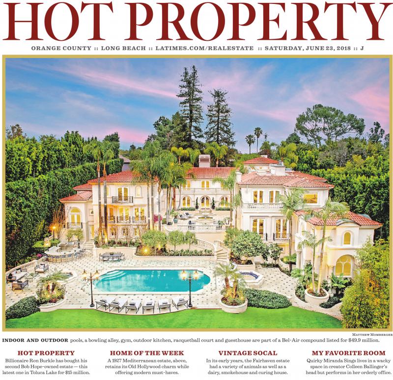 HOT PROPERT Y ORANGE COUNTY :: LONG BEACH :: LATIMES.COM/REALESTATE :: SATURDAY, JUNE 23, 2018 :: J Matthew Momberger INDOOR AND OUTDOOR pools, a bowling alley, gym, outdoor kitchen, racquetball court and guesthouse are part of a Bel-Air compound listed for $49.9 million. HOT PROPERTY Billionaire Ron Burkle has bought his second Bob Hope-owned estate — this latest one in Toluca Lake for $15 million. HOME OF THE WEEK A 1927 Mediterranean estate, above, retains its Old Hollywood charm while offering modern must-haves. VINTAGE SOCAL In its early years, the Fairhaven estate had a variety of animals as well as a dairy, smokehouse and curing house. MY FAVORITE ROOM Quirky Miranda Sings lives in a wacky space in creator Colleen Ballinger’s head but performs in her orderly office.