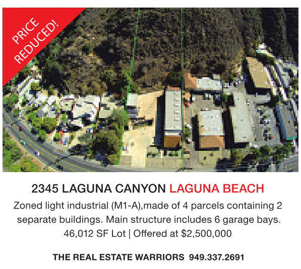 2345 LAGUNA CANYON LAGUNA BEACH Zoned light industrial (M1-A),made of4parcels containing 2 separate buildings. Main structure includes 6garage bays.