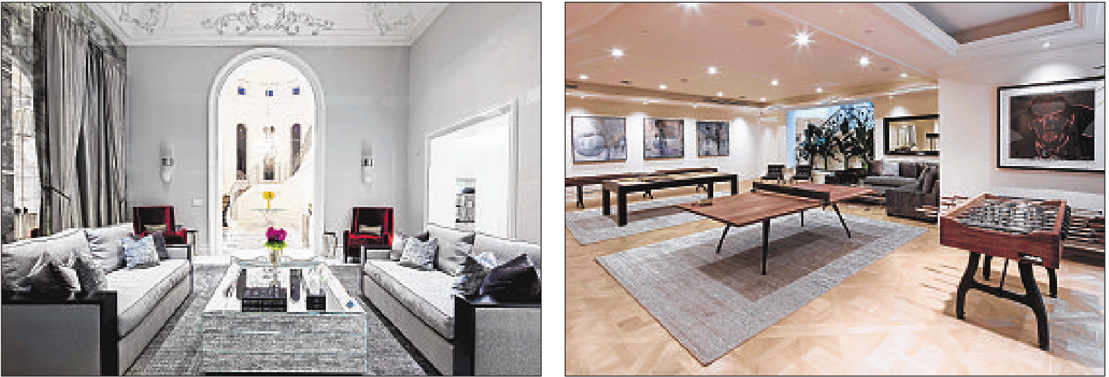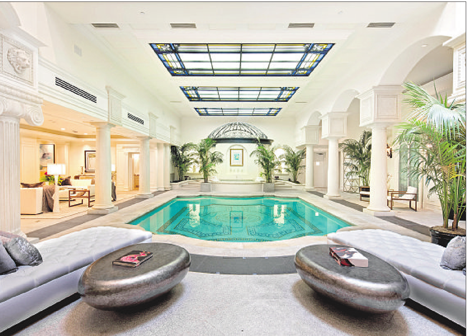 An indoor pool and spa kick things off, and surrounding columns frame poolside lounges, a massage room and sauna. The resort-like aesthetic flows into the spacious wine cellar, which has a wet bar.Apink and blue bowling alley provides a place for play.