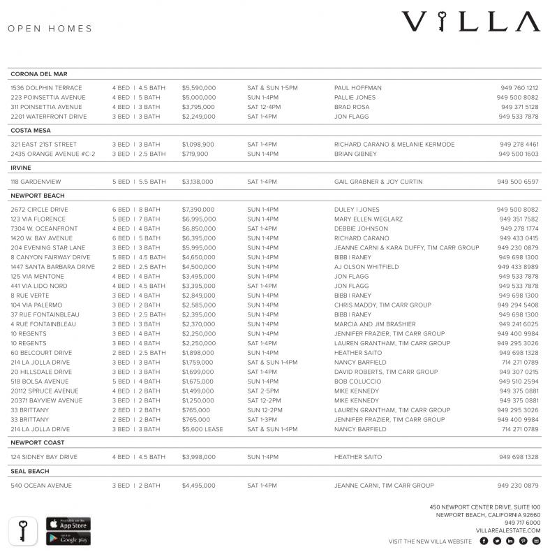 2672 CIRCLE DRIVE 6 BED | 8 BATH $7,390,000 SUN 1-4PM DULEY | JONES 949 500 8082 123 VIA FLORENCE 5 BED | 7 BATH $6,995,000 SUN 1-4PM MARY ELLEN WEGLARZ 949 351 7582 7304 W. OCEANFRONT 4 BED | 4 BATH $6,850,000 SAT 1-4PM DEBBIE JOHNSON 949 278 1774 1420 W. BAY AVENUE 6 BED | 5 BATH $6,395,000 SUN 1-4PM RICHARD CARANO 949 433 0415 204 EVENING STAR LANE 3 BED | 3 BATH $5,995,000 SUN 1-4PM JEANNE CARNI & KARA DUFFY, TIM CARR GROUP 949 230 0879 8 CANYON FAIRWAY DRIVE 5 BED | 4.5 BATH $4,650,000 SUN 1-4PM BIBB | RANEY 949 698 1300 1447 SANTA BARBARA DRIVE 2 BED | 2.5 BATH $4,500,000 SUN 1-4PM AJ OLSON WHITFIELD 949 433 8989 125 VIA MENTONE 4 BED | 4 BATH $3,495,000 SUN 1-4PM JON FLAGG 949 533 7878 441 VIA LIDO NORD 4 BED | 4.5 BATH $3,395,000 SAT 1-4PM JON FLAGG 949 533 7878 8 RUE VERTE 3 BED | 4 BATH $2,849,000 SUN 1-4PM BIBB | RANEY 949 698 1300 104 VIA PALERMO 3 BED | 2 BATH $2,585,000 SUN 1-4PM CHRIS MADDY, TIM CARR GROUP 949 294 5408 37 RUE FONTAINBLEAU 3 BED | 2.5 BATH $2,395,000 SUN 1-4PM BIBB | RANEY 949 698 1300 4 RUE FONTAINBLEAU 3 BED | 3 BATH $2,370,000 SUN 1-4PM MARCIA AND JIM BRASHIER 949 241 6025 10 REGENTS 3 BED | 4 BATH $2,250,000 SUN 1-4PM JENNIFER FRAZIER, TIM CARR GROUP 949 400 9984 10 REGENTS 3 BED | 4 BATH $2,250,000 SAT 1-4PM LAUREN GRANTHAM, TIM CARR GROUP 949 295 3026 60 BELCOURT DRIVE 2 BED | 2.5 BATH $1,898,000 SUN 1-4PM HEATHER SAITO 949 698 1328 214 LA JOLLA DRIVE 3 BED | 3 BATH $1,759,000 SAT & SUN 1-4PM NANCY BARFIELD 714 271 0789 20 HILLSDALE DRIVE 3 BED | 3 BATH $1,699,000 SAT 1-4PM DAVID ROBERTS, TIM CARR GROUP 949 307 0215 518 BOLSA AVENUE 5 BED | 4 BATH $1,675,000 SUN 1-4PM BOB COLUCCIO 949 510 2594 20112 SPRUCE AVENUE 4 BED | 2 BATH $1,499,000 SAT 2-5PM MIKE KENNEDY 949 375 0881 20371 BAYVIEW AVENUE 3 BED | 2 BATH $1,250,000 SAT 12-2PM MIKE KENNEDY 949 375 0881 33 BRITTANY 2 BED | 2 BATH $765,000 SUN 12-2PM LAUREN GRANTHAM, TIM CARR GROUP 949 295 3026 33 BRITTANY 2 BED | 2 BATH $765,000 SAT 1-3PM JENNIFER FRAZIER, TIM CARR GROUP 949 400 9984 214 LA JOLLA DRIVE 3 BED | 3 BATH $5,600 LEASE SAT & SUN 1-4PM NANCY BARFIELD 714 271 0789