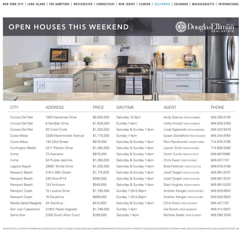San Juan Capistrano 31922 Paseo Sagrado $1,799,000 Sunday 1-4pm Gia Busch DRE# 001908323 949.412.0507 Santa Ana 3336 South Alton Court $789,000 Saturday 1-4pm Michele Kader DRE# 01438251 949.280.3245