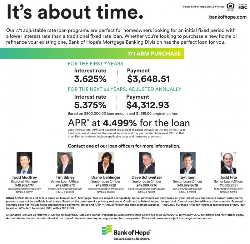 Our 7/1 adjustable rate loan programs are perfect for homeowners looking for an initial fixed period with a lower interest rate than a traditional fixed rate loan. Whether you’re looking to purchase a new home or refinance your existing one, Bank of Hope’s Mortgage Banking Division has the perfect loan for you.