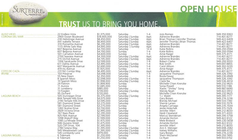 ALISO VIEJO........................................................ 22 Endless Vista $1,375,000 Saturday 1-4 JoJo Romeo 949.350.9363 CORONA DEL MAR ............................................. 2900 Ocean Boulevard $18,900,000 Saturday | Sunday Appt. Adrienne Brandes 714.401.8277 230 Heliotrope Avenue $8,450,000 Saturday | Sunday Appt. Brian Thomas | Jennifer Thomas 949.422.6409 441 Isabella Terrace $6,900,000 Saturday | Sunday Appt. Jennifer Thomas | Brian Thomas 949.422.6407 310 Poinsettia Avenue $6,295,000 Saturday | Sunday Appt. Adrienne Brandes 714.401.8277 1115 White Sails Way $4,995,000 Saturday | Sunday Appt. Adrienne Brandes 714.401.8277 607 Begonia Avenue $4,700,000 Saturday 12-4 Katie Rollins 949.293.0594 607 Begonia Avenue $4,700,000 Sunday 1-4 Katie Rollins 949.293.0594 501 Carnation Avenue $4,600,000 Sunday 1-4 Amie Raiger 949.375.4171 2700 Seaview Avenue $4,300,000 Saturday | Sunday Appt. Adrienne Brandes 714.401.8277 215 Orchid Avenue $4,195,000 Saturday | Sunday Appt. Adrienne Brandes 714.401.8277 1306 Sandcastle Drive $3,599,000 Saturday 1-4 Robert Clarke 949.293.9333 611 Dahlia Avenue $3,495,000 Saturday | Sunday 1-4 Rob Smith 949.697.8855 607 Marguerite Avenue $2,690,000 Saturday | Sunday 1-4 Carol Allison 949.302.0220 419 Iris Avenue $1,925,000 Sunday 1-4 Amie Raiger 949.375.4171 COTO DE CAZA................................................... 231742 Contijo Way $6,495,000 Saturday | Sunday Appt. Adrienne Brandes 714.401.8277 IRVINE ................................................................. 103 Preserve $4,098,000 Saturday 1-4 Jacqueline Thompson 949.326.3392 55 New Dawn $2,350,000 Saturday 1-4 Roula Fawaz 949.230.4949 8 Spanish Moss $2,098,000 Saturday | Sunday 1-4 Jacqueline Thompson 949.326.3392 10 Spanish Moss $1,998,000 Saturday | Sunday 1-4 Claire Na 949.536.4014 24 Flatiron $1,899,900 Sunday 1-4 Michelle Chien Krenzke 949.232.9625 11 Aurora $1,685,000 Sunday 1-4 Sonja Powell 949.510.1186 31 Juneberry $985,000 Saturday 1-4 Xiaoxi "Shirley" Song 949.887.6690 13 Foxglen $739,000 Saturday | Sunday 1-4 Wendy Noah 949.422.0912 95 Orchard $720,000 Sunday 1-4 Michelle Chien Krenzke 949.232.9625 LAGUNA BEACH................................................. 505 Dunnegan Drive $5,375,000 Saturday | Sunday 1-4 T.J. Walsh 949.395.1177 844 Temple Hills Drive $4,075,000 Saturday 1-4 Gary Boisen 949.274.2236 2190 Temple Hills Drive $3,595,000 Saturday 2-5 Brendy Michael 949.533.1740 581 Diamond Street $3,275,000 Saturday 1-4 Sherrie Larsen 949.510.7079 581 Diamond Street $3,275,000 Sunday 1-4 Angela Carnago 949.235.7034 1283 Skyline Drive $3,150,000 Sunday 2-5 Jessie Holechek 949.315.1529 2609 Victoria Drive $2,995,000 Saturday 1-4 Jennifer Allert 949.212.8033 167 Nyes Place $2,295,000 Saturday 1-4 Heidi Cleveland 949.371.4333 925 Park Avenue $2,199,000 Saturday 1-4 Marcus Skenderian 949.295.5758 1098 Wykoff Way $1,599,000 Saturday 1-4 Amanda Horton 949.422.6122 1085 La Mirada Street $1,475,000 Saturday | Sunday 1-4 Mele Brobeck 949.230.5658 946 Quivera Street $1,475,000 Sunday 1-4 Amanda Horton 949.422.6122 520 Cliff Drive, 104 $1,395,000 Sunday 1-4 Jennifer Allert 949.212.8033 2780 Solana Way $1,395,000 Saturday | Sunday 1-4 Ann E. Metzger 949.698.2082 945 Meadowlark Lane $1,395,000 Saturday | Sunday 1-4 Halsey Williams 949.689.4722 545 Lombardy Lane $979,000 Saturday | Sunday 1-4 Gary Boisen 949.274.2236 LAGUNA NIGUEL................................................. 6 Tidemark $1,250,000 Saturday 1-4 Sherri McDaniel 949.293.7495 6 Tidemark $1,250,000 Sunday 1-4 Liz Ryan 949.933.0702