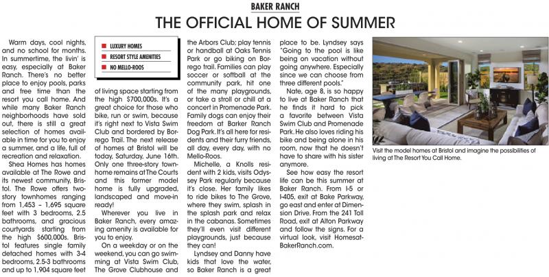 See how easy the resort life can be this summer at Baker Ranch. From I-5 or I-405, exit at Bake Parkway, go east and enter at Dimension Drive. From the 241 Toll Road, exit at Alton Parkway and follow the signs. For a virtual look, visit Homesat- BakerRanch.com.