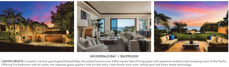 LAGUNA BEACH: Located in 24 hour guard gated Emerald Bay, this estate features over 6,800 square feet of living space with expansive unobstructed sweeping views of the Pacific. Offering five bedrooms with en suites, two separate guest quarters with private entry, 1,000 bottle wine room, infinity pool and Smart Home technology.