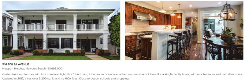 516 BOLSA AVENUE Newport Heights, Newport Beach | $1,695,000 Customized and turnkey with lots of natural light, this 5 bedroom, 4 bathroom home is attached on one side but lives like a single family home, with one bedroom and bath downstairs. Updated in 2017, it has over 3,200 sq. ft. and no HOA fees. Close to beach, schools and shopping.