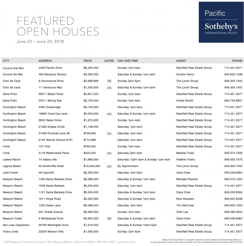 Huntington Beach 16965 Coral Cay Lane $3,050,000 [G] Saturday & Sunday 1pm-4pm Stanfield Real Estate Group 714.421.3377 Huntington Beach 3632 Rebel Circle $1,875,000 Sunday 1pm-4pm Stanfield Real Estate Group 714.421.3377 Huntington Beach 21382 Estepa Circle $1,198,000 Saturday 1pm-4pm Stanfield Real Estate Group 714.421.3377 Huntington Beach 21038 Poolside Lane #5 $799,900 [G] Saturday 1pm-4pm Stanfield Real Estate Group 714.421.3377 Huntington Beach 5142 Warner Avenue #107 $714,999 Saturday 1pm-4pm Stanfield Real Estate Group 714.421.3377 Irvine 157 Fixie $785,000 Sunday 1pm-4pm Stanfield Real Estate Group 714.421.3377 Irvine 3118 Watermarke Place $420,000 [G] Saturday 2pm-4pm Melissa Crispi 949.374.7830 Ladera Ranch 14 Galaxy Isle $1,998,000 Saturday 12pm-3pm & Sunday 1pm-4pm Heather Hosto 949.500.7576 Laguna Beach 40 Smithcliffs Road $10,500,000 [G] By Appointment The Lynch Group 949.300.7342 Lake Forest 48 Hyacinth $2,560,000 Saturday 1pm-5pm Clara Chen 949.228.6064 Newport Beach 1333 Santa Barbara Drive $5,898,000 Saturday & Sunday 1pm-4pm Michelle Peschel 949.413.1222 Newport Beach 1539 Santa Barbara $5,500,000 Saturday 1pm-4pm Stanfield Real Estate Group 714.421.3377 Newport Beach 1121 Santa Barbara Drive $5,500,000 Saturday & Sunday 1pm-5pm Clara Chen 949.228.6064 Newport Beach 1611 Kings Road $5,350,000 Saturday & Sunday 1pm-4pm Nick Abraham 949.922.6298 Newport Beach 1230 Essex Lane $3,299,000 Saturday 1pm-4pm Tim DeCinces 949.922.1833 Newport Beach 327 Anade Avenue $2,695,000 Sunday 1pm-4pm Vicki Lee 949.466.3224 Newport Coast 4 Whitesands Drive $2,650,000 [G] Saturday & Sunday 1pm-5pm Clara Chen 949.228.6064 San Juan Capistrano 28780 Martingale Drive $1,916,000 Saturday & Sunday 10am-5pm Stanfield Real Estate Group 714.421.3377 Yorba Linda 22524 Mission Hills $1,580,000 Sunday 1pm-4pm Stanfield Real Estate Group 714.421.3377