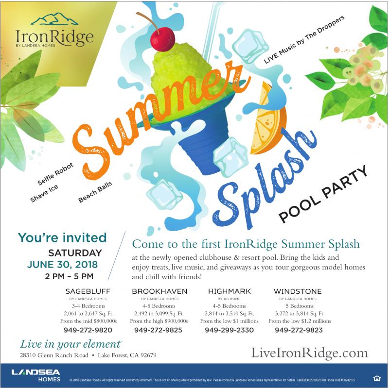 BY LANDSEA HOMES You’re invited SATURDAY JUNE 30, 2018 2 PM – 5 PM Come to the first IronRidge Summer Splash at the newly opened clubhouse & resort pool. Bring the kids and enjoy treats, live music, and giveaways as you tour gorgeous model homes and chill with friends! BY LANDSEA HOMES 3-4 Bedrooms 2,061 to 2,647 Sq.Ft. From the mid $800,000s 949-272-9820 BY LANDSEA HOMES 4-5 Bedrooms 2,492 to 3,099 Sq. Ft. From the high $900,000s 949-272-9825 BY KB HOME 4-5 Bedrooms 2,814 to 3,510 Sq. Ft. From the low $1 millions 949-299-2330 BY LANDSEA HOMES 5 Bedrooms 3,272 to 3,814 Sq. Ft. From the low $1.2 millions 949-272-9823 28310 Glenn Ranch Road • Lake Forest, CA 92679 LiveIronRidge.com ©2018 Landsea Homes. All rights reserved and strictly enforced. This is not an offering where prohibited by law.Please consult aLandsea Homes sales representativefor details. CalBRE#02030520 KB Home BRE#00242327
