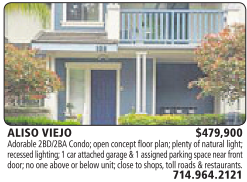 ALISO VIEJO $479,900 Adorable 2BD/2BACondo;open concept floor plan; plenty of natural light; recessed lighting; 1car attached garage &1assigned parking space near front door; no one above or below unit; closetoshops,toll roads&restaurants.