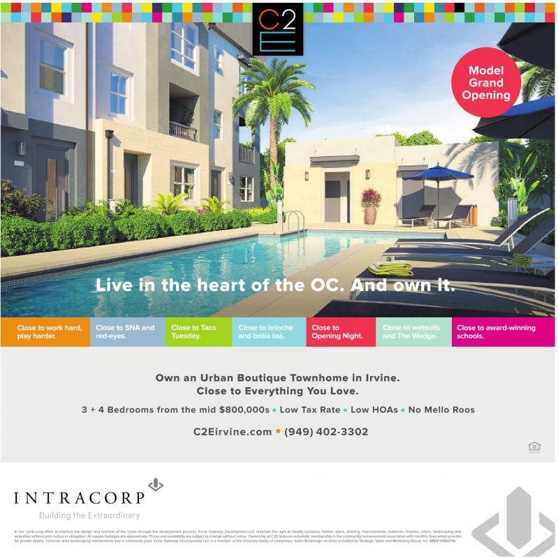 Model Grand Opening Live in the heart of the OC. And own it. Close to work hard, play harder. Close to SNA and red-eyes. Close to Taco Tuesday. Close to brioche and boba tea. Close to Opening Night. Close to wetsuits and The Wedge. Close to award-winning schools. Own an Urban Boutique Townhome in Irvine. Close to Everything You Love. 3 + 4 Bedrooms from the mid $800,000s Low Tax Rate Low HOAs No Mello Roos C2Eirvine.com (949) 402-3302 In our continuing effort to improve the design and function of the home through the development process, Irvine Gateway Development LLC reserves the right to modify locations, homes, plans, phasing, improvements, materials, finishes, colors, landscaping and amenities without prior notice or obligation. All square footages are approximate.Prices and availability are subject to change without notice.Ownership at C2E features automatic membership in the community homeowner(s) association with monthly dues which provide for private streets, common area landscaping maintenance and acommunity pool. Irvine Gateway Development LLC isamember ofthe Intracorp family of companies. Sales Brokerage services provided by Strategic Sales and Marketing Group, Inc. BRE# 01862116.