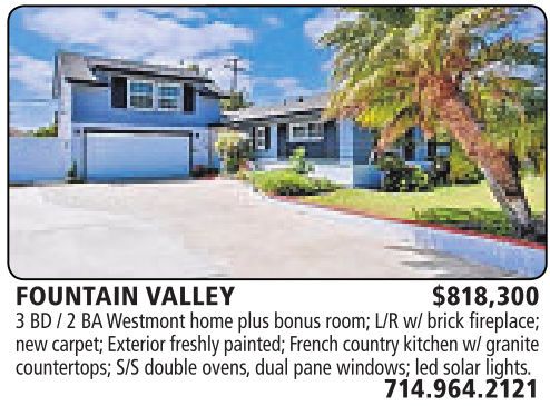 FOUNTAIN VALLEY $818,300 3BD/2BAWestmont home plus bonus room; L/R w/ brick fireplace; new carpet;Exteriorfreshly painted; French countrykitchen w/ granite countertops; S/Sdouble ovens,dual pane windows; led solar lights.