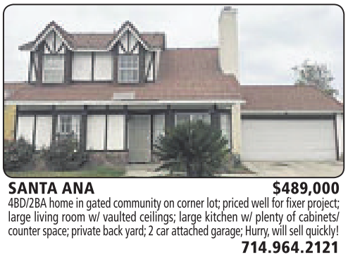 SANTA ANA $489,000 4BD/2BAhome in gated community on corner lot; priced well for fixer project; large living room w/ vaulted ceilings; large kitchen w/ plenty of cabinets/ counter space; private back yard; 2car attached garage; Hurry,will sell quickly! 714.964.2121 See also