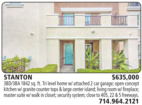 STANTON $635,000 3BD/3BA 1842 sq.ft. Trilevel home w/ attached2cargarage; openconcept kitchen w/ granitecountertops &large centerisland; living room w/ fireplace; master suite w/ walkincloset; securitysystem; close to 405, 22 &5freeways.