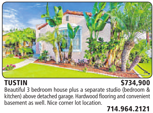 TUSTIN $734,900 Beautiful 3bedroom house plus aseparate studio (bedroom & kitchen) abovedetached garage. Hardwood flooring and convenient basement as well. Nice corner lot location.
