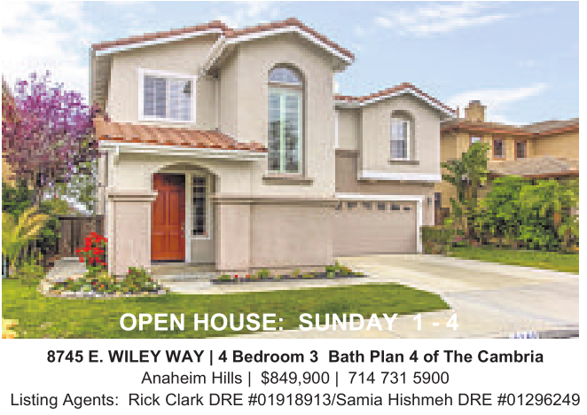 8745 E.WILEY WAY |4Bedroom 3 Bath Plan 4of The Cambria Anaheim Hills | $849,900 | 714 731 5900 Listing Agents: Rick Clark DRE #01918913/Samia Hishmeh DRE #01296249