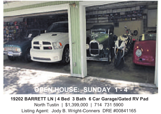 19202 BARRETT LN |4Bed 3 Bath 6Car Garage/Gated RVPad North Tustin | $1,399,000 | 714 731 5900 Listing Agent: Jody B.Wright-Conners DRE #00841165