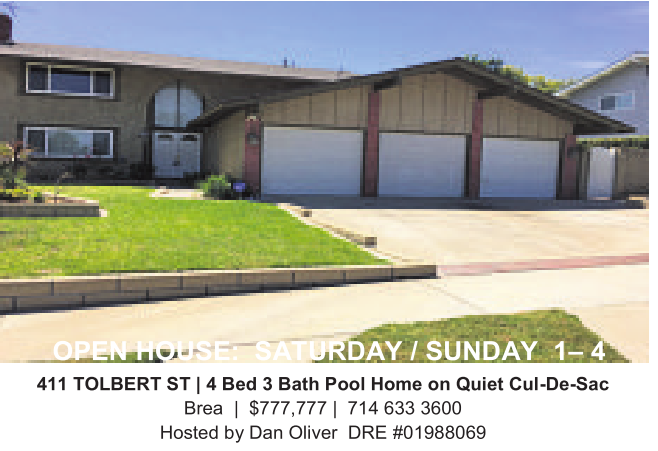 411 TOLBERT ST|4Bed 3Bath Pool Home onQuiet Cul-De-Sac Brea | $777,777 | 714 633 3600 Hosted by Dan Oliver DRE #01988069