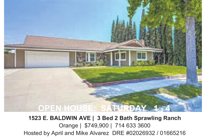 1523 E.BALDWIN AVE | 3Bed 2Bath Sprawling Ranch Orange | $749,900 | 714 633 3600 Hosted by April and Mike Alvarez DRE #02026932 /01665216