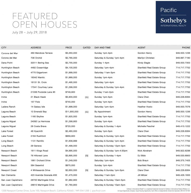 Huntington Beach 21038 Poolside Lane #5 $749,900 Sunday 11am-2pm Stanfield Real Estate Group 714.717.7752 Irvine 21 Black Hawk $5,900,000 [G] Sunday 1pm-5pm Clara Chen 949.228.6064 Irvine 157 Fixie $740,000 Sunday 1pm-4pm Stanfield Real Estate Group 714.717.7752 Ladera Ranch 14 Galaxy Isle $1,998,000 Saturday 1pm-4pm Heather Hosto 949.500.7576 Laguna Beach 10 Emerald Bay $11,900,000 [G] By Appointment Gordon Henry 949.500.1236 Laguna Beach 1160 Skyline $1,925,000 Sunday 1pm-4pm Stanfield Real Estate Group 714.717.7752 Laguna Niguel 24092 La Hermosa $1,299,900 Sunday 1pm-4pm Stanfield Real Estate Group 714.717.7752 Laguna Niguel 28 Costa Brava $720,000 Saturday & Sunday 1-4pm Michelle Peschel 949.413.1222 Lake Forest 48 Hyacinth $2,460,000 Sunday 1pm-5pm Clara Chen 949.228.6064 Lake Forest 2164 Rushford $859,900 Saturday & Sunday 1pm-4pm Stanfield Real Estate Group 714.717.7752 Long Beach 1131 Ramillo $1,639,999 Saturday & Sunday 1pm-4pm Stanfield Real Estate Group 714.717.7752 Long Beach 29 Geneva $1,499,000 Saturday & Sunday 12pm-3pm Stanfield Real Estate Group 714.717.7752 Newport Beach 1611 Kings Road $4,995,000 Saturday & Sunday 1pm-4:30pm Nick Abraham 949.922.6298 Newport Beach 76 Hillcrest Lane $3,895,000 [G] Saturday & Sunday 1-4pm DJ Bibb 949.533.6900 Newport Beach 1661 Orchard Drive $1,249,000 Saturday 1pm-4pm Bob Braun 949.375.7405 Newport Beach 384 Seawind $875,000 Sunday 1pm-4pm Stanfield Real Estate Group 714.717.7752 Newport Coast 4 Whitesands Drive $2,650,000 [G] Saturday & Sunday 1pm-5pm Clara Chen 949.228.6064 San Clemente 423 Avenida Granada #35 $1,475,000 Saturday 11am-2pm Jill Mitzer 949.426.1833 San Juan Capistrano 28700 Martingale Drive $1,982,900 Saturday & Sunday 10am-5pm Stanfield Real Estate Group 714.717.7752 San Juan Capistrano 28810 Martingale Drive $1,760,900 Saturday & Sunday 10am-5pm Stanfield Real Estate Group 714.717.7752