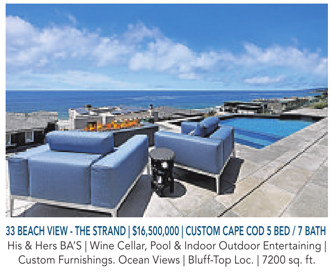 33 BEACH VIEW -THE STRAND |$16,500,000 |CUSTOM CAPE COD 5BED /7BATH His & Hers BA’S | Wine Cellar, Pool & Indoor Outdoor Entertaining | Custom Furnishings. Ocean Views | Bluff-Top Loc. | 7200 sq. ft.