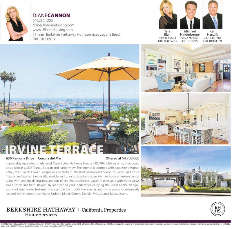 DIANECANNON 949.230.1200 diane@lbhomebuying.com www.LBhomebuying.com #1 Team Berkshire Hathaway HomeServices Laguna Beach DRE 01090918 Tara Blair 949.412.2594 DRE 00805703 Michael Hinderberger 949.478.4851 DRE 01919850 Ken Hanzlik 949. 338.1666 DRE 01904189 C 630 Ramona Drive | Corona del Mar Offered at $4,788,000 Impeccably upgraded single-level Cape Cod-style home boasts 4BD/4BA with an office that could be utilized as a 5BD. Tranquil ocean and harbor view. The interior is adorned with exquisite designer detail, from Ralph Lauren wallpaper and Richard Marshall hardwood flooring to Perrin and Rowe fixtures and Walker Zanger tile, marble and granite. Spacious open kitchen hosts a custom center island with seating, dining area, and top-of-the-line appliances. Lavish master suite with water views and a resort-like bath. Beautifully landscaped yard, perfect for enjoying the vistas to the tranquil sound of dual water features, is accessible from both the master and living room. Conveniently located within close proximity to Fashion Island, Corona Del Mar Village, and Balboa Island. ©2018 BerkshireHathaway HomeServices CaliforniaProperties (BHHSCP)isamember of the franchise system of BHH AffiliatesLLC.BHH AffiliatesLLC and BHHSCP do notguarantee accuracyofall data including measurements,conditions,and features of property.Information is obtained from varioussources andwill not be verified by broker or MLS. #1 BHHSCPLaguna Beach Office Team for2017, verified through Internal BHHSCP Reports.