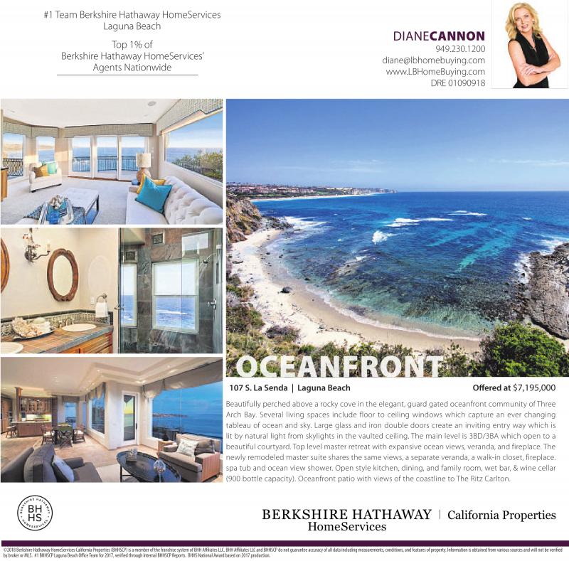 #1 Team Berkshire Hathaway HomeServices Laguna Beach Top 1% of Berkshire Hathaway HomeServices’ Agents Nationwide DIANECANNON 949.230.1200 diane@lbhomebuying.com www.LBHomeBuying.com DRE 01090918 OCEANFRONTO 107 S. La Senda | Laguna Beach Offered at $7,195,000 Beautifully perched above a rocky cove in the elegant, guard gated oceanfront community of Three Arch Bay. Several living spaces include floor to ceiling windows which capture an ever changing tableau of ocean and sky. Large glass and iron double doors create an inviting entry way which is lit by natural light from skylights in the vaulted ceiling. The main level is 3BD/3BA which open to a beautiful courtyard. Top level master retreat with expansive ocean views, veranda, and fireplace.The newly remodeled master suite shares the same views, a separate veranda, a walk-in closet, fireplace. spa tub and ocean view shower. Open style kitchen, dining, and family room, wet bar, & wine cellar (900 bottle capacity). Oceanfront patio with views of the coastline to The Ritz Carlton. ©2018 BerkshireHathaway HomeServices CaliforniaProperties (BHHSCP)isamember of the franchise system of BHH AffiliatesLLC.BHH AffiliatesLLC and BHHSCP do notguarantee accuracyofall data including measurements,conditions,and features of property.Information is obtained from varioussources andwill not be verified by broker or MLS. #1 BHHSCP Laguna Beach OfficeTeam for2017, verified through Internal BHHSCP Reports. BHHS National Awardbased on 2017 production.