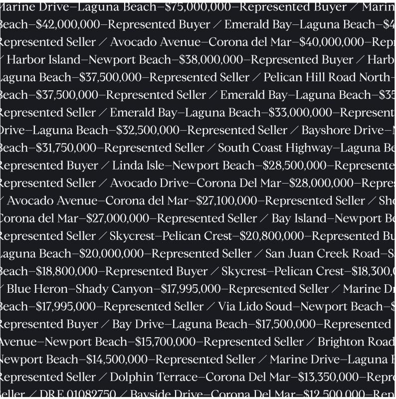 Marine Drive–Laguna Beach–$75,000,000–Represented Buyer Marin Beach–$42,000,000–Represented Buyer Emerald Bay–Laguna Beach–$4 Represented Seller Avocado Avenue–Corona del Mar–$40,000,000–Repr Harbor Island–Newport Beach–$38,000,000–Represented Buyer Harbo Laguna Beach–$37,500,000–Represented Seller Pelican Hill Road North– Beach–$37,500,000–Represented Seller Emerald Bay–Laguna Beach–$35,000 Represented Seller Emerald Bay–Laguna Beach–$33,000,000–Represente Drive–Laguna Beach–$32,500,000–Represented Seller Bayshore Drive–N Beach–$31,750,000–Represented Seller South Coast Highway–Laguna Bea Represented Buyer Linda Isle–Newport Beach–$28,500,000–Represente Represented Seller Avocado Drive–Corona Del Mar–$28,000,000–Repres Avocado Avenue–Corona del Mar–$27,100,000–Represented Seller Sho Corona del Mar–$27,000,000–Represented Seller Bay Island–Newport Bea Represented Seller Skycrest–Pelican Crest–$20,800,000–Represented Bu Laguna Beach–$20,000,000–Represented Seller San Juan Creek Road–Sa Beach–$18,800,000–Represented Buyer Skycrest–Pelican Crest–$18,300,000– Blue Heron–Shady Canyon–$17,995,000–Represented Seller Marine Dri Beach–$17,995,000–Represented Seller Via Lido Soud–Newport Beach–$ Represented Buyer Bay Drive–Laguna Beach–$17,500,000–Represented S Avenue–Newport Beach–$15,700,000–Represented Seller Brighton Road Newport Beach–$14,500,000–Represented Seller Marine Drive–Laguna B Represented Seller Dolphin Terrace–Corona Del Mar–$13,350,000–Repre Seller DRE 01082750 Bayside Drive–Corona Del Mar–$12,500,000–Repr