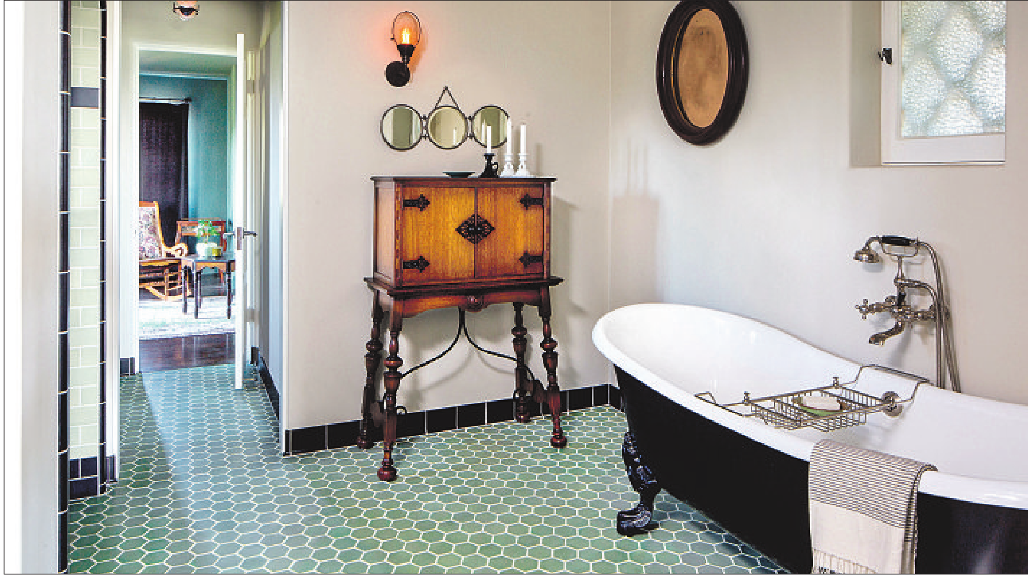 The original bath there served two bedrooms in a Jack-and-Jill fashion. By removing inner walls, enough space opened up for a double pedestal vanity and a large walk-in shower. They took cues for the green tiles and black trim from the home’s other bathrooms.