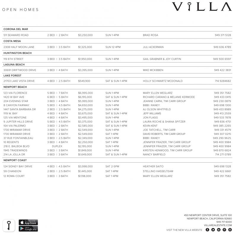 CORONA DEL MAR 511 SEAWARD ROAD 2 BED | 2 BATH $3,250,000 SUN 1-4PM BRAD ROSA 949 371 5128 COSTA MESA 2308 HALF MOON LANE 3 BED | 3.5 BATH $1,325,000 SUN 12-4PM JULI ACKERMAN 949 636 4789 HUNTINGTON BEACH 119 6TH STREET 3 BED | 3.5 BATH $1,950,000 SUN 1-4PM GAIL GRABNER & JOY CURTIN 949 500 6597 LAGUNA BEACH 30691 DRIFTWOOD DRIVE 3 BED | 4 BATH $3,395,000 SUN 1-4PM MIKE MCKIBBEN 949 422 3831 LAKE FOREST 21703 LAKE VISTA DRIVE 4 BED | 2.5 BATH $549,900 SAT & SUN 1-4PM HOLLY SCHWARTZ MCDONALD 714 9284682 NEWPORT BEACH 123 VIA FLORENCE 5 BED | 7 BATH $6,995,000 SUN 1-4PM MARY ELLEN WEGLARZ 949 351 7582 1420 W BAY AVE 6 BED | 5 BATH $6,195,000 SAT & SUN 1-4PM RICHARD CARANO & MELANIE KERMODE 949 433 0415 204 EVENING STAR 3 BED | 4 BATH $5,995,000 SUN 1-4PM JEANNE CARNI, TIM CARR GROUP 949 230 0879 8 CANYON FAIRWAY 5 BED | 4.5 BATH $4,650,000 SUN 1-4PM BIBB | RANEY 949 698 1300 1447 SANTA BARBARA DR 2 BED | 2.5 BATH $4,275,000 SUN 1-4PM AJ OLSON WHITFIELD 949 433 8989 1119 W. BAY 4 BED | 4 BATH $3,675,000 SAT & SUN 1-4PM JEFF WILLIAMS 949 413 2559 125 VIA MENTONE 4 BED | 4 BATH $3,495,000 SUN 1-4PM JON FLAGG 949 533 7878 9 JUPITER HILLS DRIVE 5 BED | 4.5 BATH $3,375,000 SAT & SUN 1-4PM LAURA ROCHE & SHANA SPITZER 949 836 4751 104 VIA PALERMO 3 BED | 2 BATH $2,585,000 SAT & SUN 1-4PM KEVIN KENT 949 385 2265 1730 MIRAMAR DRIVE 3 BED | 2 BATH $2,549,000 SUN 1-4PM JOE TATCHELL, TIM CARR 949 331 4579 1730 MIRAMAR DRIVE 3 BED | 2 BATH $2,549,000 SAT 1-4PM DAVID ROBERTS, TIM CARR GROUP 949 307 0215 37 RUE FONTAINBLEAU 3 BED | 2.5 BATH $2,349,000 SUN 1-4PM BIBB | RANEY 949 290 9625 10 REGENTS 3 BED | 4 BATH $2,250,000 SAT 1-4PM JENNIFER FRAZIER, TIM CARR GROUP 949 400 9984 218 E. BALBOA BLVD DUPLEX $2,195,000 SUN 1-4PM JENNIFER FRAIZER, TIM CARR GROUP 949 400 9984 1945 TRADEWINDS 3 BED | 3 BATH $1,849,000 SUN 1-4PM KIRSTEN HENWOOD, TIM CARR GROUP 949 870 6824 214 LA JOLLA DR 3 BED | 3 BATH $1,649,000 SAT & SUN 1-4PM NANCY BARFIELD 714 271 0789