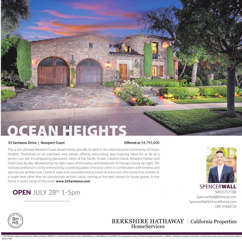 OCEAN HEIGHTS 33 Sarteano Drive | Newport Coast Offered at $4,795,000 This is the ultimate Newport Coast dream home, proudly located in the ultra-exclusive community of Ocean Heights. Positioned on an oversized view parcel, offering astounding, awe-inspiring views for as far as a person can see. Encompassing panoramic views of the Pacific Ocean, Catalina Island, Newport Harbor and Gold Coast by day. Mesmerizing city light views of the harbor and landmarks of Orange County by night. The intimate ambiance is richly enhanced by a soothing palate of neutral colors in combination with timeless and spectacular architecture. Comfort, ease and uncompromising luxury at every turn, this home lives entirely as a single level other than an ultra-private upstairs casita, serving as the ideal retreat for house guests. A true home in every sense of the word. www.33Sarteano.com OPEN JULY 28 th pm SPENCERWALL 949.375.7768 SpencerWall@bhhscal.com SpencerWall.bhhscalifornia.com DRE 01840729 ©2018 BerkshireHathaway HomeServices California Properties (BHHSCP)isamember of the franchise system of BHH AffiliatesLLC.BHH AffiliatesLLC and BHHSCP do not guaranteeaccuracyofall data including measurements,conditions,and features of property.Information is obtained from varioussources and will not be verified by broker or MLS.