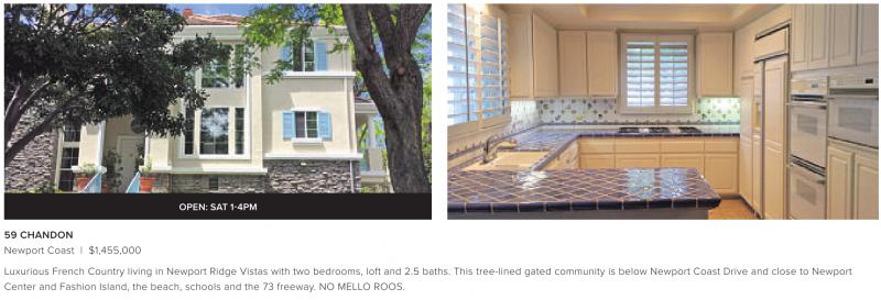 OPEN: SAT 1-4PM 59 CHANDON Newport Coast | $1,455,000 Luxurious French Country living in Newport Ridge Vistas with two bedrooms, loft and 2.5 baths. This tree-lined gated community is below Newport Coast Drive and close to Newport Center and Fashion Island, the beach, schools and the 73 freeway. NO MELLO ROOS. See also