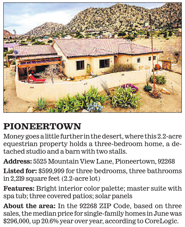 PIONEERTOWN Money goes a little further in the desert, where this 2.2-acre equestrian property holds a three-bedroom home, a detached studio and a barn with two stalls. Address: 5525 Mountain View Lane, Pioneertown, 92268 Listed for: $599,999 for three bedrooms, three bathrooms in 2,219 square feet (2.2-acre lot) Features: Bright interior color palette; master suite with spa tub; three covered patios; solar panels About the area: In the 92268 ZIP Code, based on three sales, the median price for single-family homes in June was $296,000, up 20.6% year over year, according to CoreLogic. See also