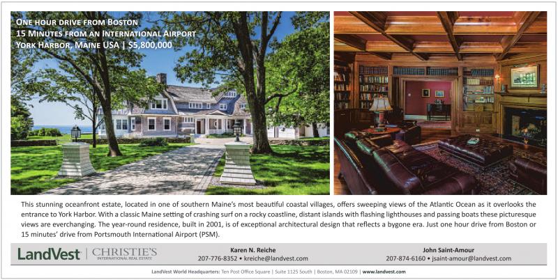 O B 15 M I A Y H , M USA | $5,800,000 This stunning oceanfront estate, located in one of southern Maine’s most beau ful coastal villages, offers sweeping views of the Atlan c Ocean as it overlooks the entrance to York Harbor.With aclassic Maine se ng of crashing surf on arocky coastline, distant islands with flashinglighthouses and passing boats these picturesque views are everchanging. The year-round residence, built in 2001, is of excep onal architectural design that reflects a bygone era. Just one hour drive from Boston or 15 minutes’ drive from Portsmouth Interna onal Airport (PSM). Karen N. Reiche 207-776-8352 • kreiche@landvest.com John Saint-Amour 207-874-6160 • jsaint-amour@landvest.com LandVestWorld Headquarters: TenPostOffice Square |Suite1125 South |Boston, MA 02109 | www.landvest.com