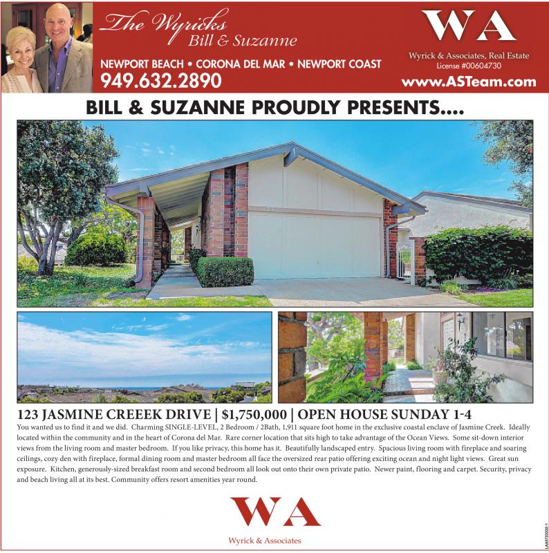 The Wyricks Bill & Suzanne NEWPORT BEACH • CORONA DEL MAR • NEWPORT COAST Wyrick & Associates, Real Estate License #00604730 949.632.2890 www.ASTeam.com BILL & SUZANNE PROUDLY PRESENTS…. 123 JASMINE CREEEK DRIVE | $1,750,000 | OPEN HOUSE SUNDAY 1-4 You wanted us to find it and we did. Charming SINGLE-LEVEL, 2 Bedroom / 2Bath, 1,911 square foot home in the exclusive coastal enclave of Jasmine Creek. Ideally located within the community and in the heart of Corona del Mar. Rare corner location that sits high to take advantage of the Ocean Views. Some sit-down interior views from the living room and master bedroom. If you like privacy, this home has it. Beautifully landscaped entry. Spacious living room with fireplace and soaring ceilings, cozy den with fireplace, formal dining room and master bedroom all face the oversized rear patio offering exciting ocean and night light views. Great sun exposure. Kitchen, generously-sized breakfast room and second bedroom all look out onto their own private patio. Newer paint, flooring and carpet. Security, privacy and beach living all at its best. Community offers resort amenities year round.