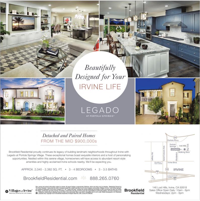 Beautifully Designed for Your IRVINE LIFE Detached and Paired Homes FROM THE MID $900,000s Brookfield Residential proudly continues its legacy of building landmark neighborhoods throughout Irvine with Legado at Portola Springs Village. These exceptional homes boast exquisite interiors and a host of personalizing opportunities. Nestled within this serene village, homeowners will have access to abundant resort-style amenities and highly-acclaimed Irvine schools nearby. We’ll be expecting you. APPROX. 2,040 - 2,382 SQ. FT. • 3 - 4 BEDROOMS • 3 - 3.5 BATHS BrookfieldResidential.com 888.265.0760 Plan, pricing and product information subject to change. All square footage is approximate. Windows, decks and doors varybyelevation. “Masterfully Planned by The Irvine Company” means thatthe Irvine Companycreated the master land plan for all Irvine Companycommunities. Villages of Irvine ® and Portola Springs ® are registered trademarks of the Irvine CompanyLLC. The “master land plan” includes the overall entitlement and design of eachcommunity but does not include the design, construction and sale of homes. The design, construction and sale of homes is the sole responsibility of community builders. The Irvine Companyisnot designing, constructing or offering homes for sale in anycommunity.Map is an artist’sconception and is not to scale. Model photography is for illustrative purposes only.Copyright ©2018 Brookfield Residential. All Rights Reserved. DRE License #01896289. Portola Springs LEGADO Woodbury™ Town Center IRVINE N MAP NOT TO SCALE Irvine Spectrum Center ® 146 Lost Hills, Irvine, CA 92618 Sales Office Open Daily: 10am - 6pm Wednesdays: 2pm - 6pm