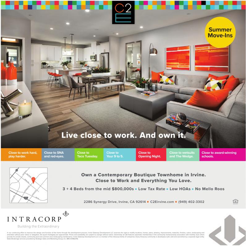 In our continuing effort to improve the design and function of the home through the development process, Irvine Gateway Development LLC reserves the right to modify locations, homes, plans, phasing, improvements, materials, finishes, colors, landscaping and amenities without prior notice or obligation. All square footage(s) are approximate. Prices and availability are subject to change without notice. Ownership at C2E features automatic membership in the community homeowner(s) association with monthly dues which provide for private streets, community pool and common area landscaping maintenance. Irvine Gateway Development LLC isamember ofthe Intracorp family of companies. Every Intracorp community is developed, built, sold and warranted by aseparate legal entity. Sales Brokerage services provided by Strategic Sales and Marketing Group, Inc. BRE #01862116.