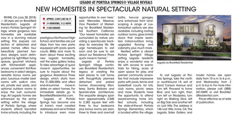 “Legado at Portola Springs has become one of Irvine’s most coveted addresses and we’rethrilled to introduce even more