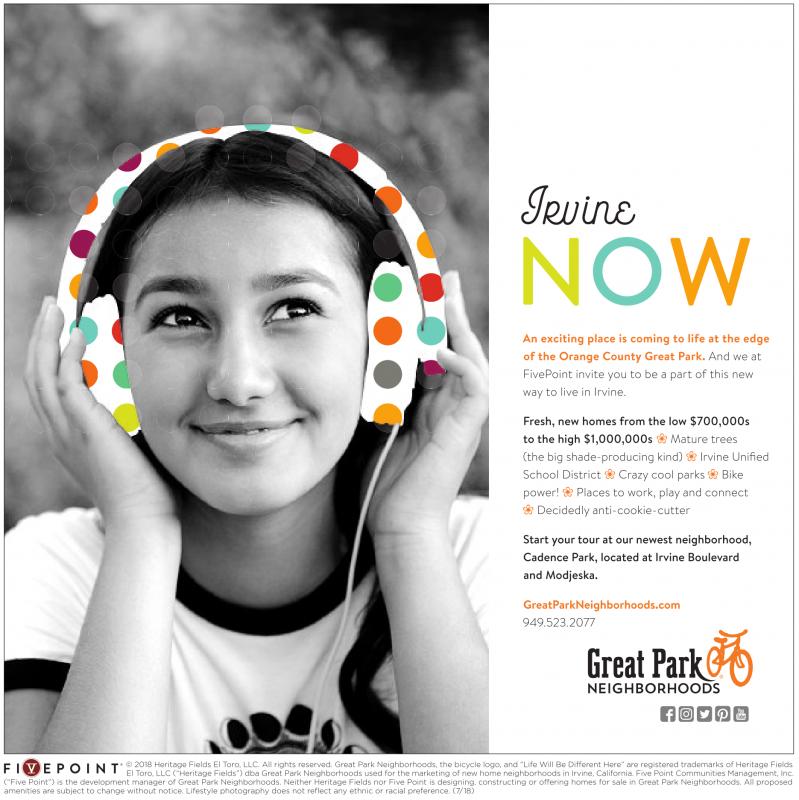©2018 Heritage Fields El Toro, LLC. All rights reserved. Great Park Neighborhoods, the bicycle logo, and “Life Will Be Different Here” are registered trademarks ofHeritage Fields El Toro, LLC (“Heritage Fields”) dba Great Park Neighborhoods used for the marketing ofnew home neighborhoods in Irvine, California. Five Point Communities Management, Inc.