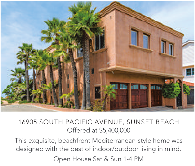 16905 SOUTH PACIFIC AVENUE, SUNSET BEACH Offered at $5,400,000 This exquisite, beachfront Mediterranean-style home was designed with the best of indoor/outdoor living in mind.