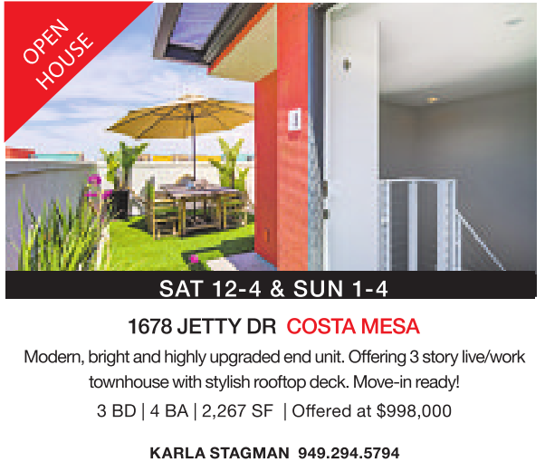 SAT 12-4 & SUN 1-4 1678 JETTYDR COSTAMESA Modern,bright andhighlyupgradedend unit. Offering3story live/work townhouse with stylish rooftopdeck. Move-inready!